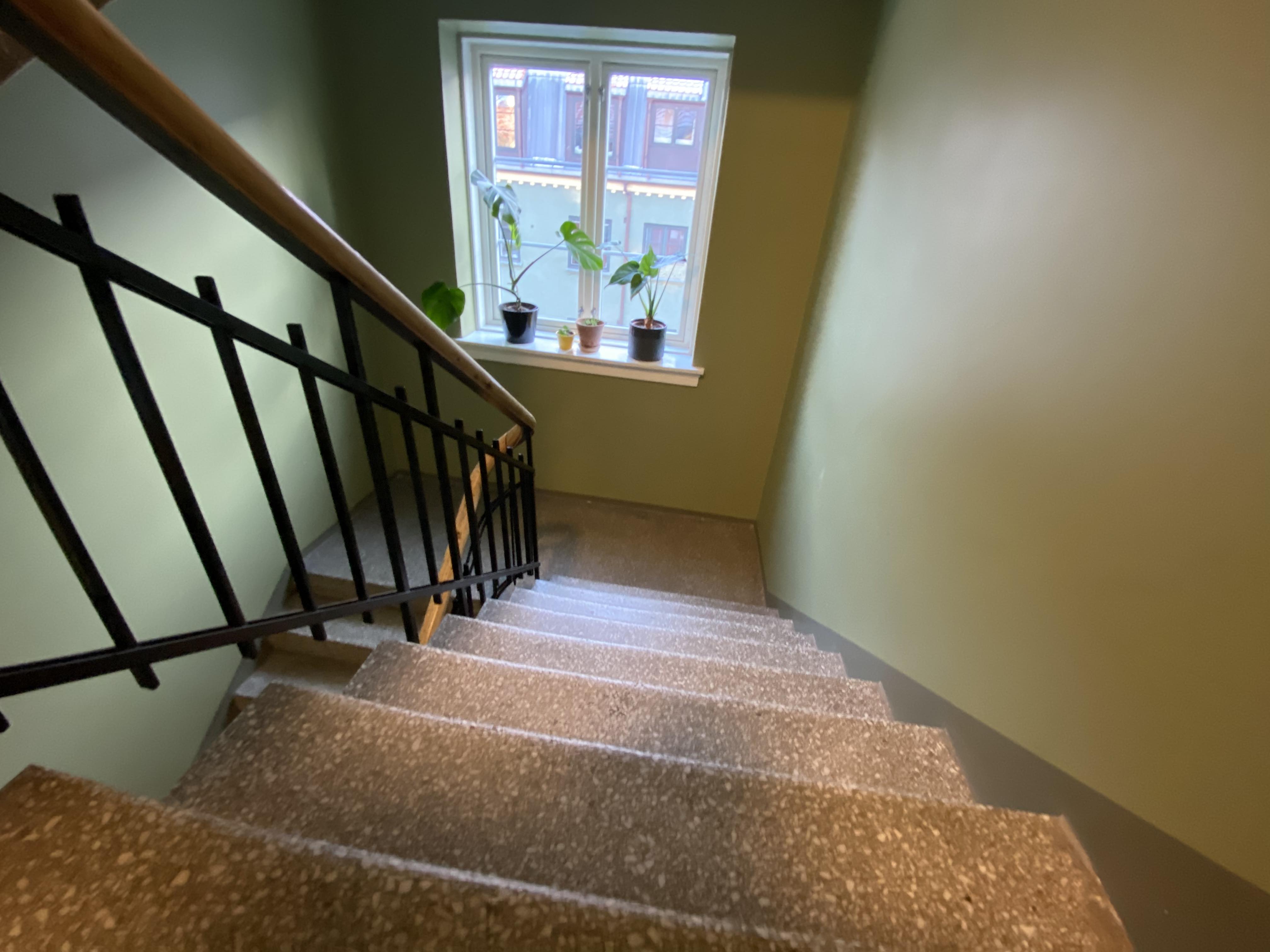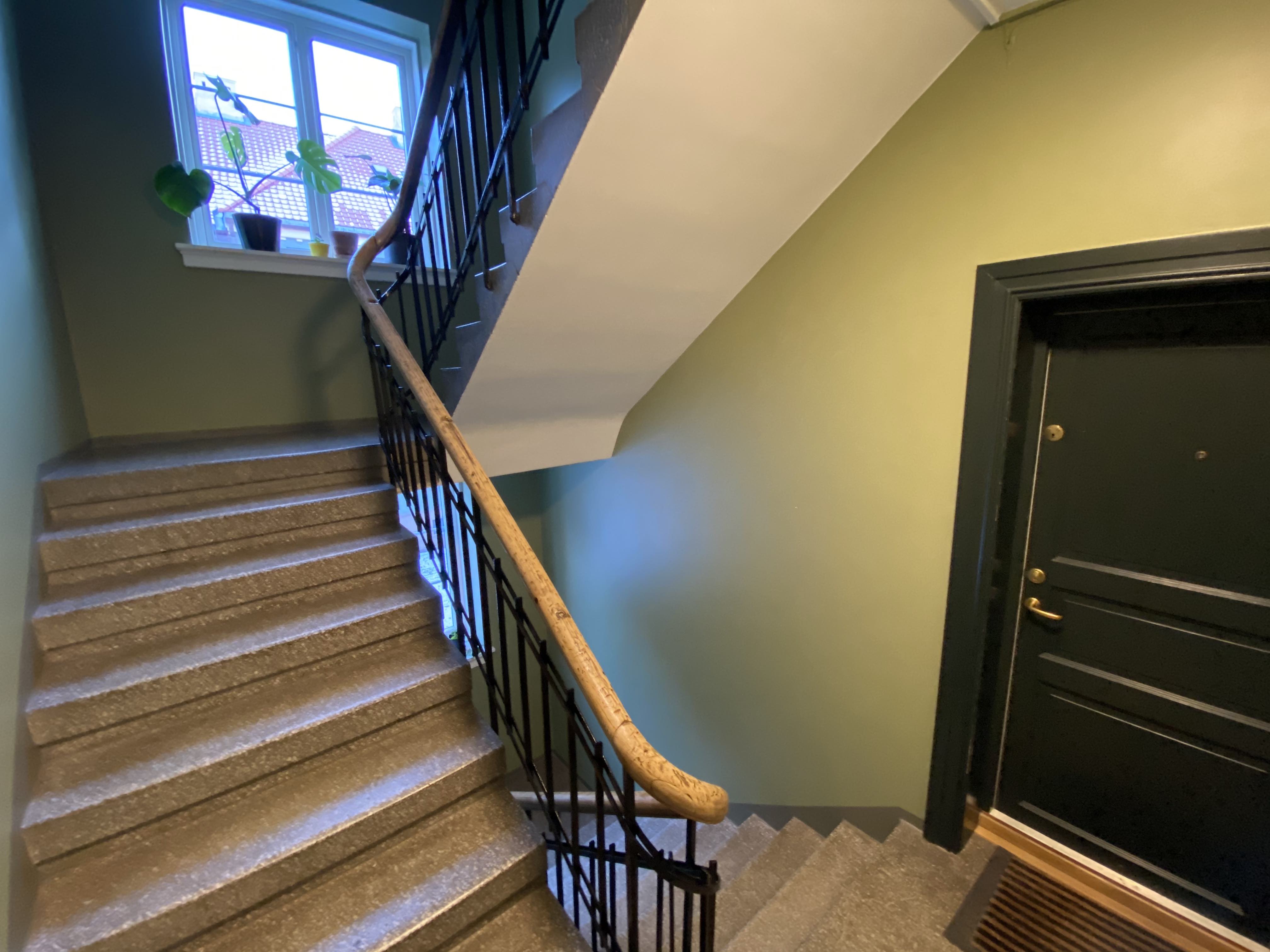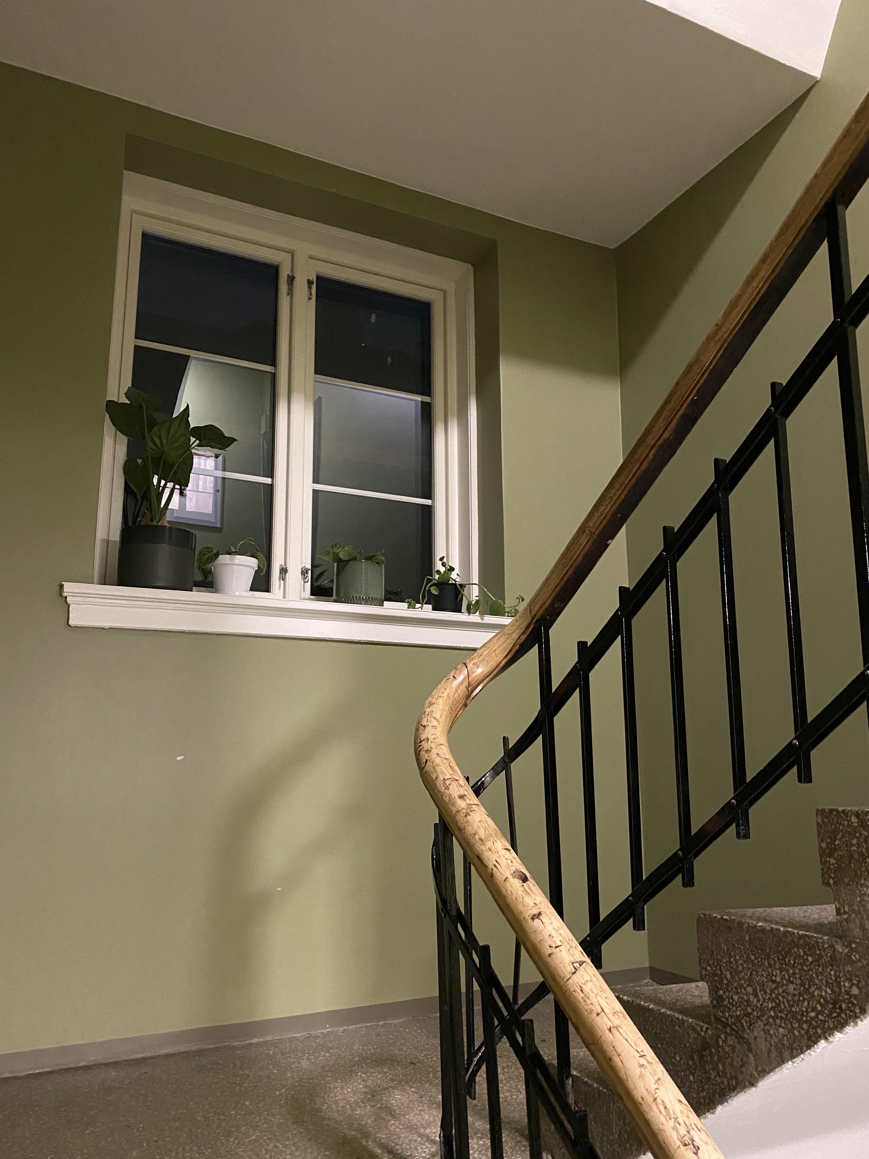 Fargene som brukes er valgt av historiske, estetiske og praktiske årsaker. Grønnfargen som er valgt på veggene er en lysere utgave av fargen på de grønne byggene, og dørene er malt i samme farge som vinduskarmene på bygget. Trappene settes inn med et middel for å bevare steinen, og gelenderet lakkes forsiktig med en klar lakk. Det blir også montert ny belysning med bevegelsessensor.